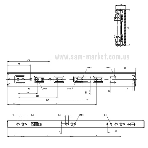 Направляющая телескопическая 450 мм PUSH TO OPEN MULLER (17745)