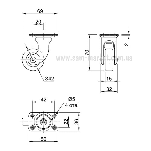 Ролик мебельный с площадкой d= 42 мм R 10080 пластиковый хром / черный FERRO FIORI (21713)