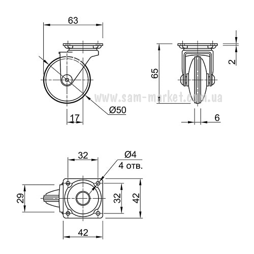 Ролик мебельный с площадкой d= 50 мм R 10060 прорезиненный алюминий / черный FERRO FIORI (21714)