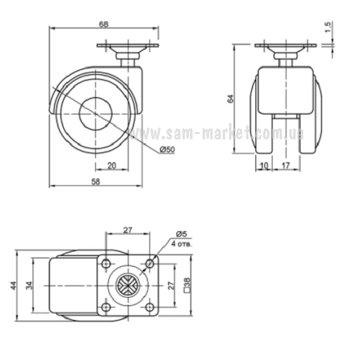 Ролик с площадкой d=50 мм пластиковый лиловый (20155)